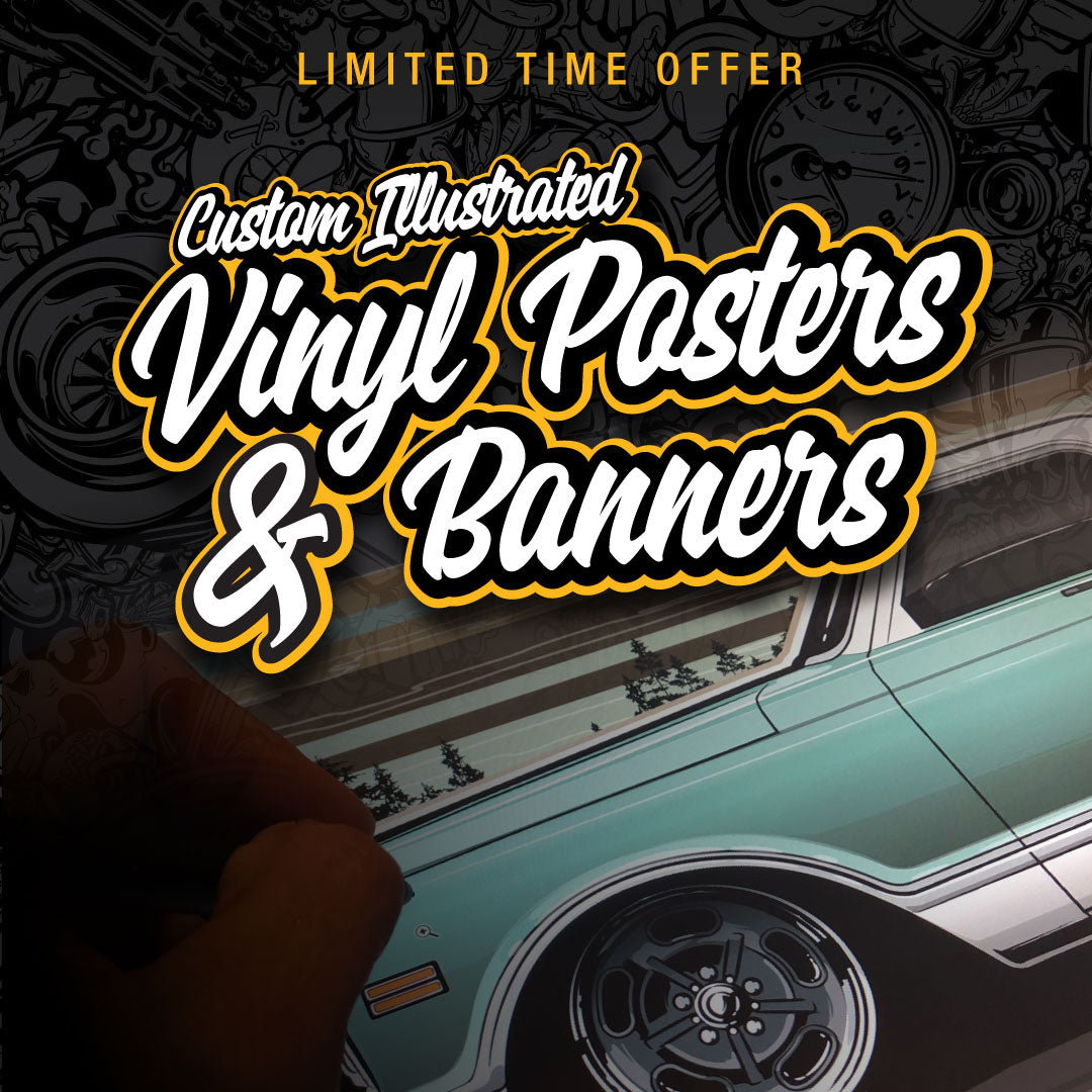 Custom Illustrated Vehicle Banners. Each piece is designed from your vehicle and professionally printed to create a bold statement—perfect for your garage, office, or display.